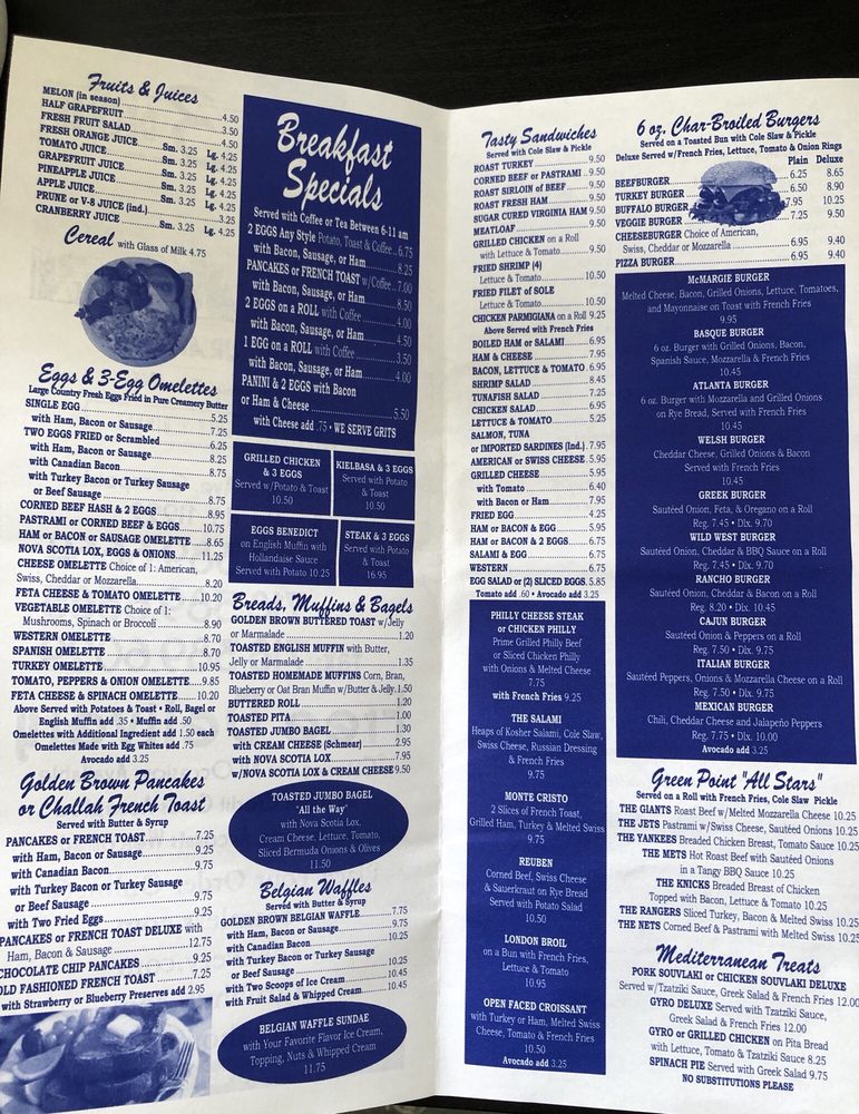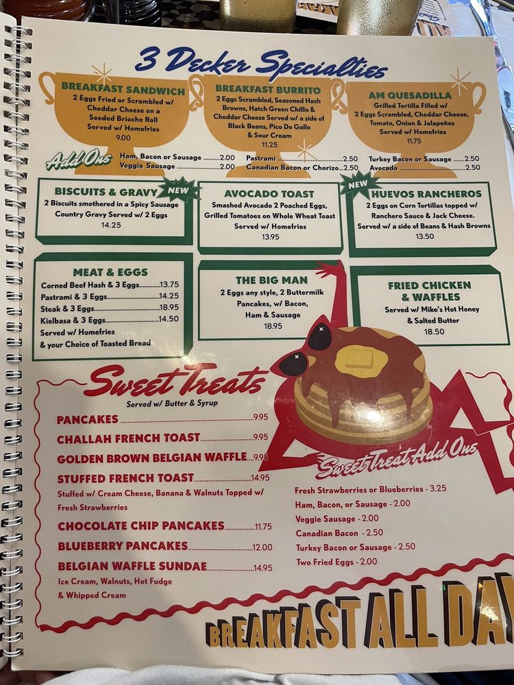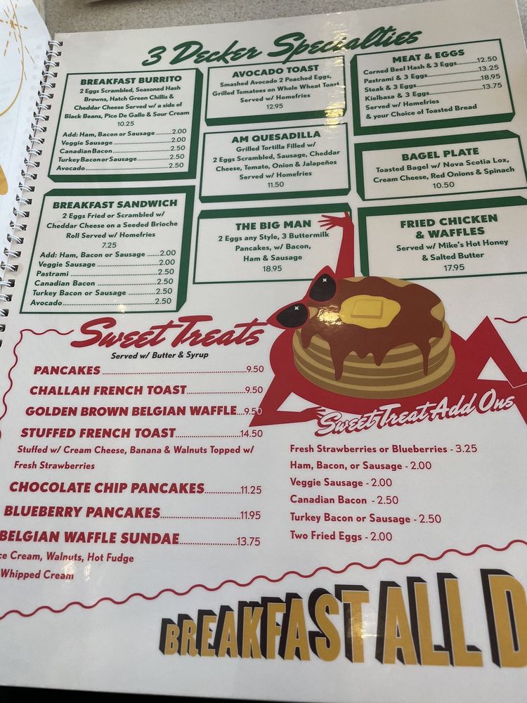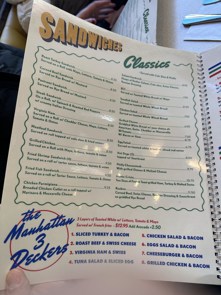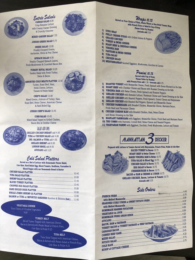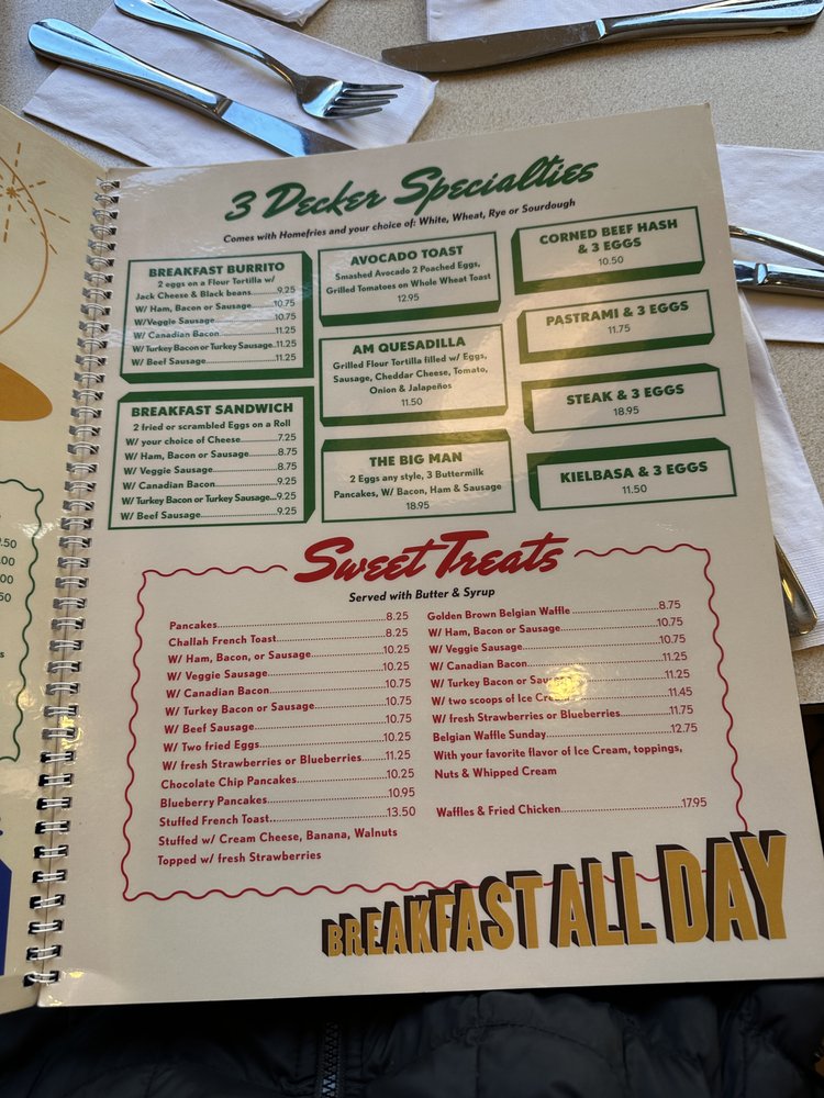 Manhattan Three Decker is a cozy diner located in Brooklyn, NY offering a diverse menu for all-day breakfast, sweet treats, and starters. With its classic ambiance and friendly service, this spot has become a favorite for patrons looking for a hearty meal. The menu features dishes like Eggs Benedict, Stuffed French Toast, and Chicken Pot Pie, all prepared with care and served in generous portions. Customers praise the quality of the food and the welcoming atmosphere, making it a go-to spot for brunch or casual dining. Don't miss out on their famous pancakes and delicious sandwiches, like the pastrami and roast beef options. Whether you're a fan of traditional breakfast fare or comfort food classics, Manhattan Three Decker has something for everyone to enjoy.